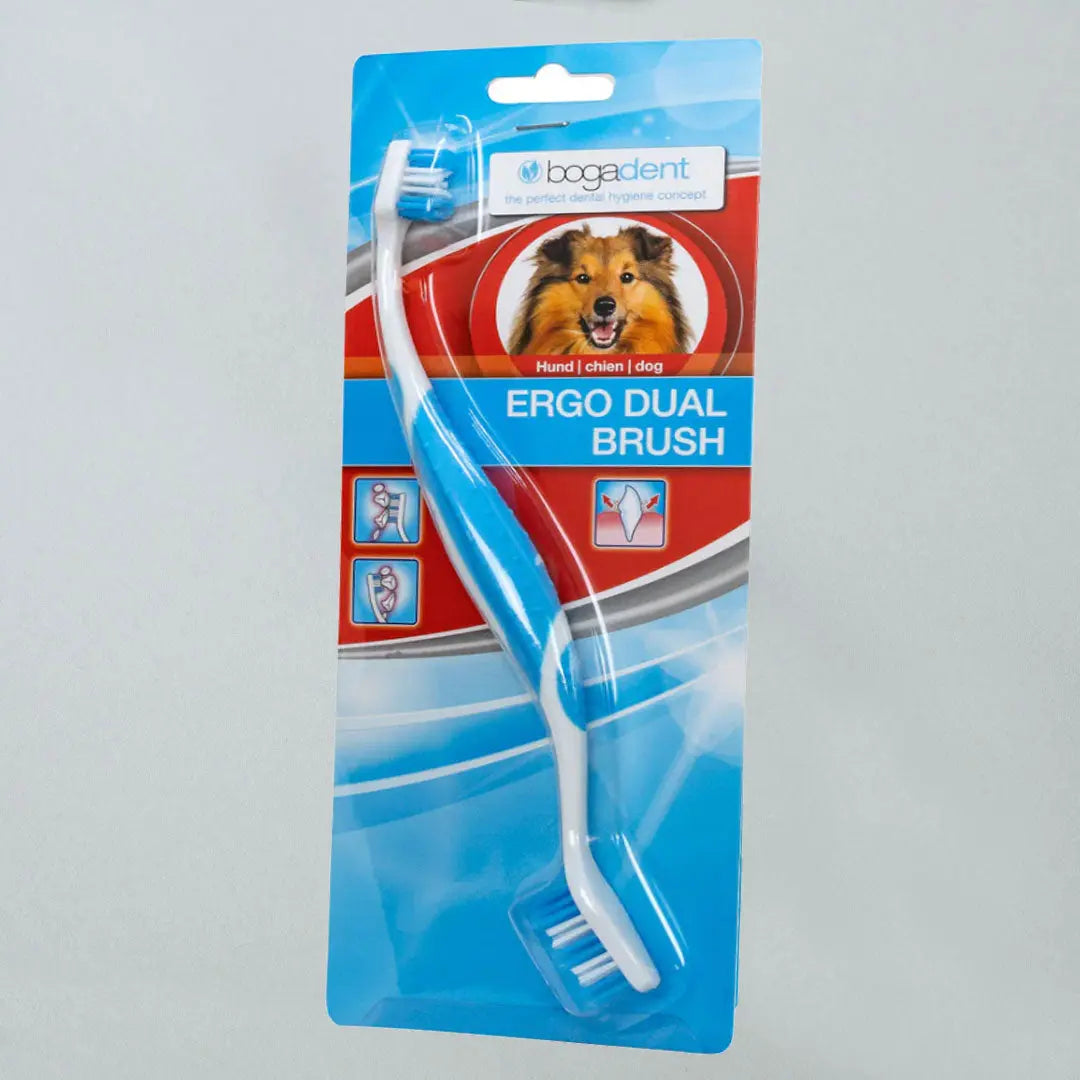 Regelmäßiges Zähneputzen mit der bogadent® Zahnbürste hilft, Zahnbelag zu reduzieren, Zahnstein, Mundgeruch, Entzündungen und Infektionen vorzubeugen und unterstützt nachhaltig die Zahngesundheit Deines Hundes. Entwickelt in enger Zusammenarbeit mit Tierärzten und Zahnärzten, garantiert die ERGO DUAL BRUSH maximalen Komfort und schonende Anwendung – selbst bei kräftigen Kaumuskeln.