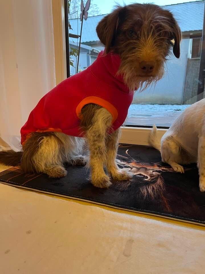 Wenn die Luft morgens schon frisch ist oder der Wind am Meer ordentlich pfeift, ist „COZY“ genau das Teil, das sofort gute Laune macht: leuchtender Pink-Sweatshirtstoff, dazu orangefarbene Bündchen – Ton-in-Ton, modern und super clean. Innen wartet eine flauschige, kuschelige Innenseite, die Brust und Rücken angenehm warm hält, ohne deinen Hund in seiner Bewegung einzuschränken.