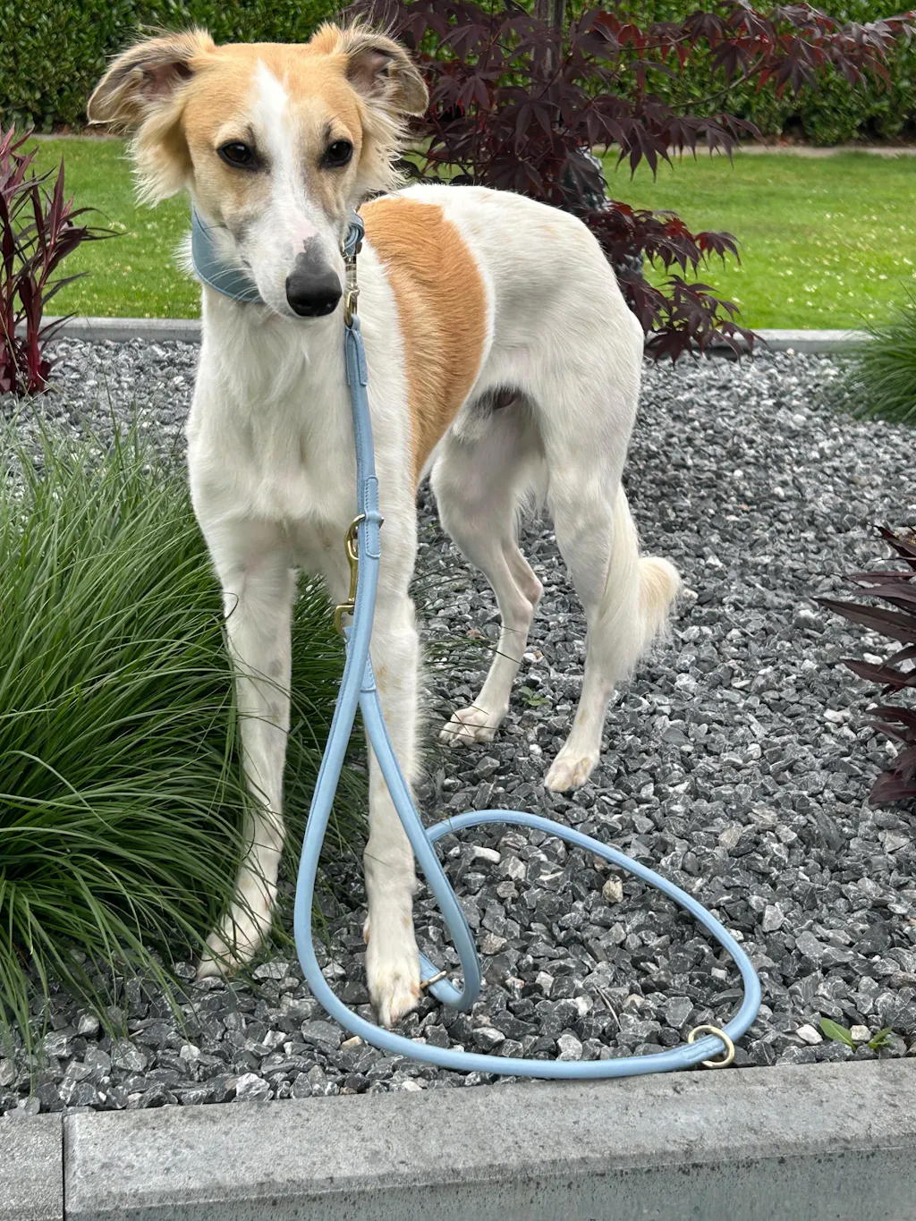 Hundeleine aus feinstem Nappaleder „Rolled Nappa“ in sanftem Blauton ist verstellbar und vielseitig einsetzbar.